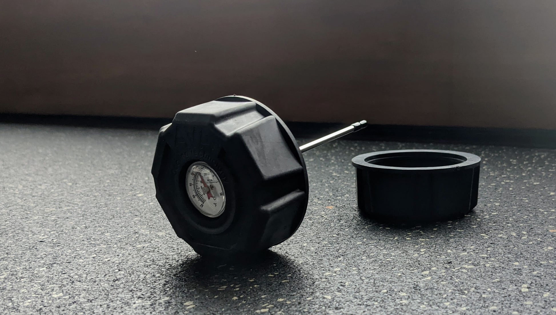 Anodized aluminum, PVC (rubber end caps), metal thermometer with plastic dial, plastic safety cover for thermometer